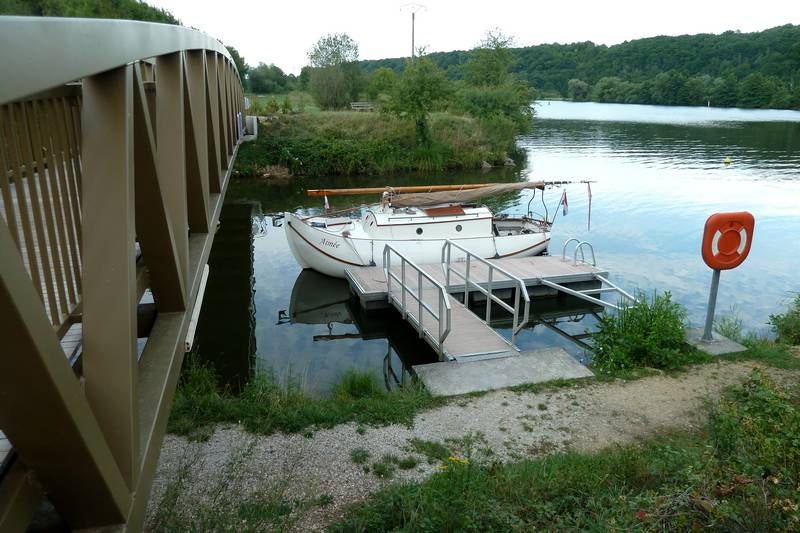 9-7 's Morgens eerst op de fiets naar de bakker. Op de heenweg over de voetgangersbrug over de sluis, en terug gewoon over de verkeersbrug. Een leuk tochtje van hier af. Om negen uur gooi ik de trossen los, en lig een kwartier later voor de eerste sluis. Er komt eerst wat van de andere kant, dus wachten! Na een half uurtje kan ik invaren. Het is een wat vervelende sluis voor de pleziervaart, want opgebouwd uit grof damwandprofiel, maar met wat extra stootwillen en goed opletten lukt het wel. Om 12.45 pauze in sluis Vaires. De deuren stonden open, en de lichten op groen, dus ik kon gewoon invaren. Volgens mijn waterkaart is er pauze van 12.30 tot 13.30, maar om 13.20 gaan de deuren achter mij al dicht, ga ik 45 cm omhoog, en kom ik weer op de Marne. Om 16.00 uur kom ik aan bij Esbly. Gelukkig is het pontonnetje vrij, maar om daar te komen wordt een probleem. Allemaal waterplanten. Ik leg de boot eerst even in het kanaal aan de kant, aan een paar meerpennen, en loop met vaarboom en pikhaak naar het ponton. daar druk, en trek ik de laag waterplanten naast het ponton zoveel mogelijk weg, zodat er ongeveer een vrije ligplaats ontstaat. Dan weer terug naar de boot, en op hoop van zegen. Ik zoek een route met wat open plekken, en vaar achteruit, met een aanloopje ernaartoe. Ik kom ver genoeg om van de boot op het ponton te kunnen stappen, en trek hem daarna naast en tegen het ponton aan. Zo die ligt vast!