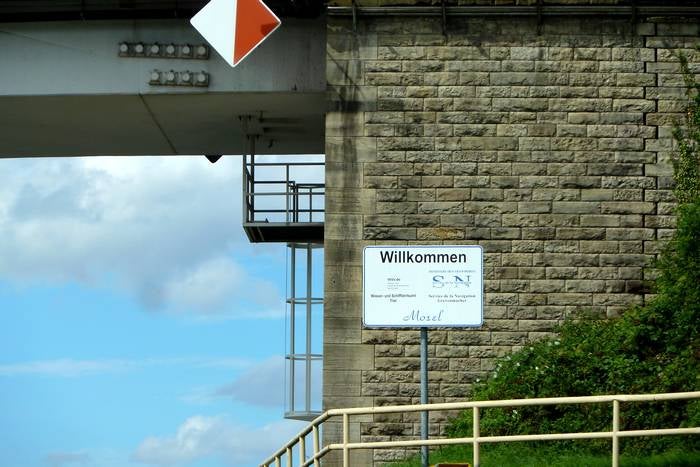 Om vier uur lig ik voor sluis Apach, op de grens van Frankrijk, Duitsland en Luxemburg, en een half uur later vaar ik de grens over.