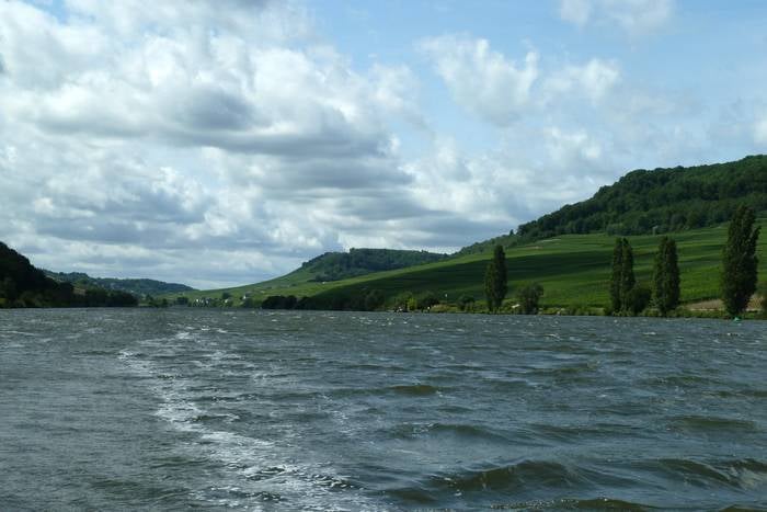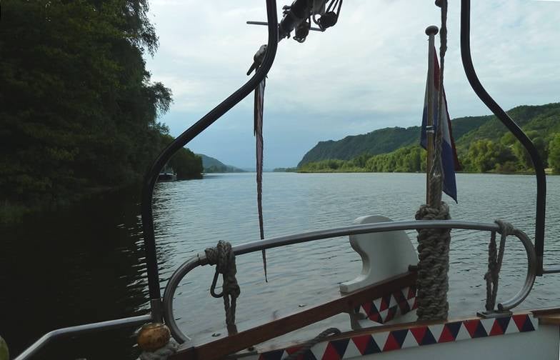 Nog zo'n 70 km tot aan de Rijn, en die wil ik vandaag zien te halen, dus op tijd weg. Het is 6.30 wanneer ik vertrek en om 15.30 lig ik voor de sluis van Koblenz. Er komt eerst een schip van de andere kant,