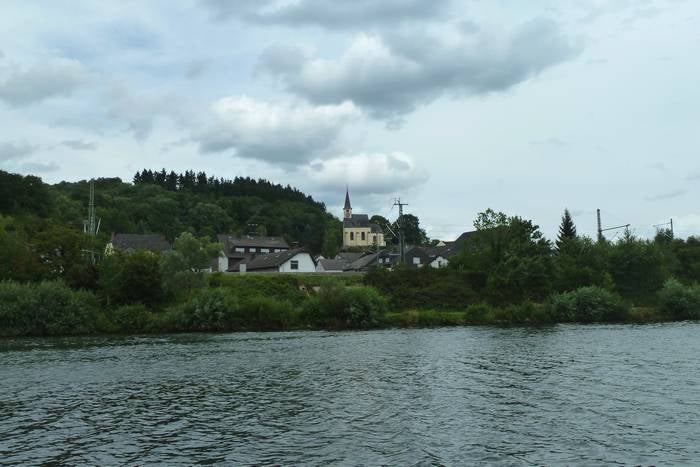 Tegen twee uur meer ik aan bij Wasserbilig voor brood. Het is zondag, en alles blijkt dicht. Dan maar lunchen met de "riemen" die ik heb. De havenmeester komt langs wanneer ik zit te eten, en doet moeilijk wanneer hij hoort dat ik niet wil blijven liggen. Misschien houd ik een plaats bezet van een potentiële klant. Het is nog 6 km tot de haven van Konz,