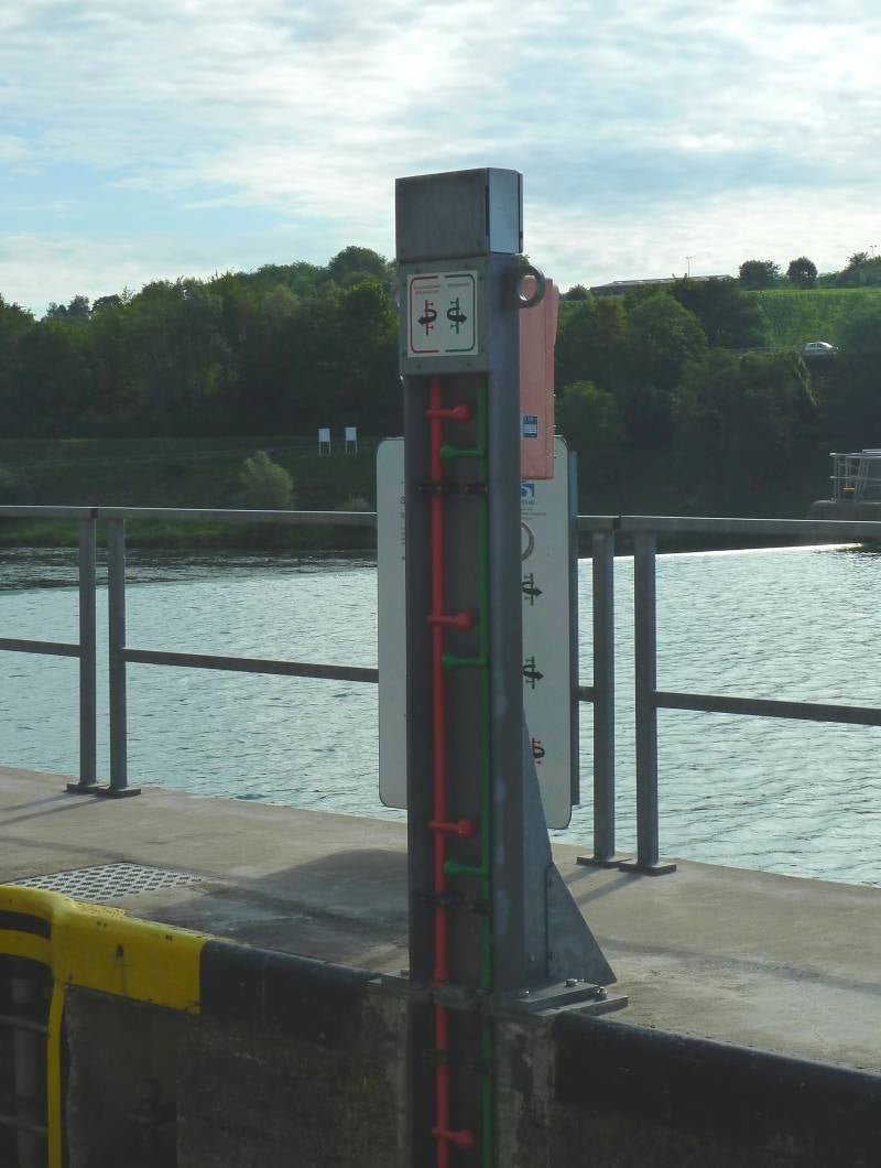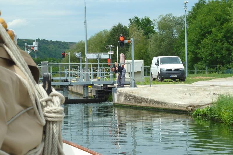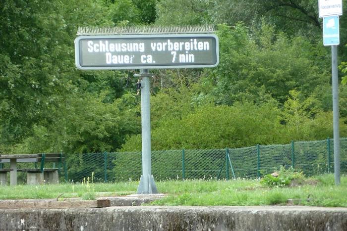 31-7 Eerst even naar de winkel voor: 1 Dornfelder lieblich, (wijn dus) 1 Weltmeisterbrot, (Kom daar maar eens om bij Beste Bakker Berghuis!) 2 Brenspiritus, 1 Grobe bratwurst, Zehn Eier, (bodenhaltung) 1 Getr. tomaten, 0,75 kg. Zwiebel, en 500 gr. paprikamix. Zo, ik kan weer even vooruit, en om 8.45 start ik de motoren en laat ik Konz achter mij. Het is half bewolkt en 20 graden. Hier heb je kleine zelfbedieningssluisjes naast de grote sluizen.