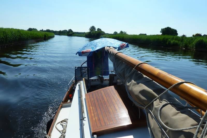 en om 11.45 meer al ik bij Zwartsluis aan. Ik heb al jaren een jerrycan voor diesel die niet goed afsluit, en daar wil ik nu eens een nieuwe voor kopen bij Koos Slurink Watersport. De watertank gooi ik even vol bij Jachthaven Kranerweerd, en daarna via de nieuwe sluis het Zwarte Water op. Dat is breed genoeg om dankzij de stuurautomaat tijdens het varen veilig een boterham met een gebakken eitje klaar te maken, en ik kook ook meteen een eitje voor op de rundvleessalade voor vanavond. Het is 15.15 wanneer ik de Spooldersluis uitvaar.