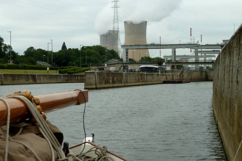 Er komt net iemand aan in een autootje van de VNF, en van hem hoor ik dat ze pas om negen uur beginnen te schutten vanwege gebrek aan water, maar eerst moet hij het water tussen de twee sluizen 45 cm laten zakken, want er moet een passagiersschip door de tunnel. Anders lukt dat niet vanwege de hoogte van het schip.