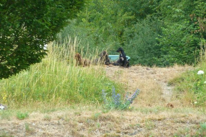 Omdat de sluizen soms zo dicht bij elkaar liggen zou je anders ook de sluis waar je net uitgekomen bent weer kunnen activeren. (Wanneer je dus ook met deze, avalant, naar beneden zou kunnen schutten.) Om half drie meer ik pas even aan om te eten. Het is half bewolkt, 28 graden, en er staat een harde wind op de kont! (Van de boot, dus ook van mij.) Om kwart voor zes meer ik aan in het wild in de schaduw van de bomen aan de overkant. Die bomen staan op een heuvel, en de zon is inmiddels net vergenoeg gezakt.