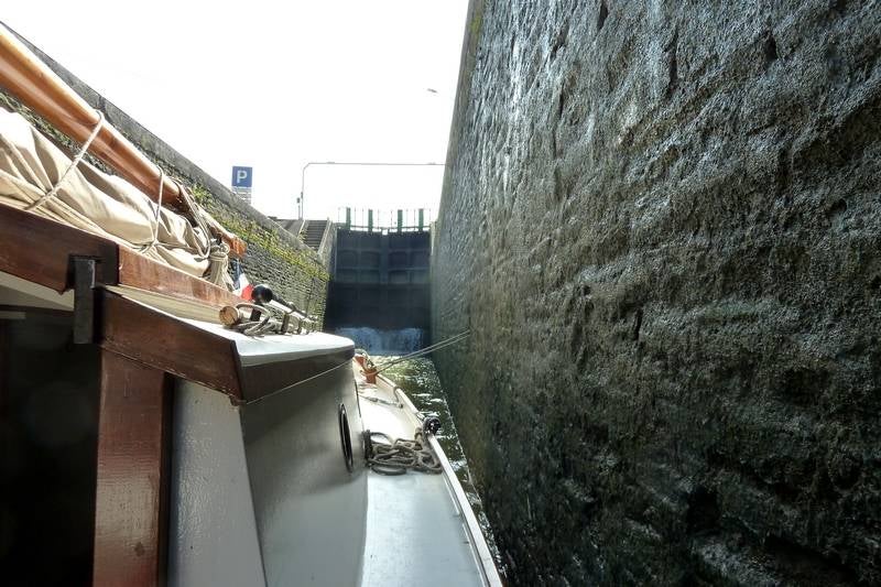 Na verloop van tijd loopt er iemand vanuit de huizen naast de sluis(?) over de deuren en even later gaan de deuren achter mij dicht. Normaal wordt er hier even een touwtje aangepakt, want het is een sluis met een groot verval, maar deze keer is dat kennelijk te veel moeite. Wanneer ik een eind gestegen ben wip ik het touw maar van de bolder en laat ik de Aimée los achter in de sluis drijven en corrigeer af en toe even met motor en roer. Normaal mag dat niet, maar dan moeten ze maar helpen met aanmeren. Om vijf uur ben ik er door,