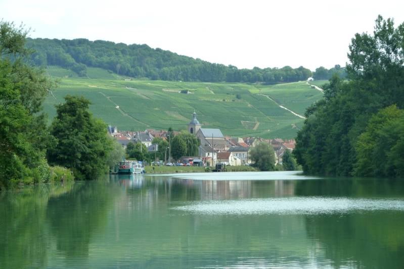 Om 12.15 meer ik aan bij Epernay, voor de supermarkt. Daar gooi ik de laatste liters diesel uit de jerrycans in de tank, en vul ze daarna alle drie bij de pomp daar, ongeveer 85 ltr. In de loop van de morgen is het weer steeds beter geworden, en met mooi weer vaar ik zo'n 4 km terug naar de sluis waardoor ik op het Canal-Lateral-à-la-Marne kom. Wanneer ik door de sluis ben meer ik "in het wild" ergens op een schaduwplekje aan om te eten.