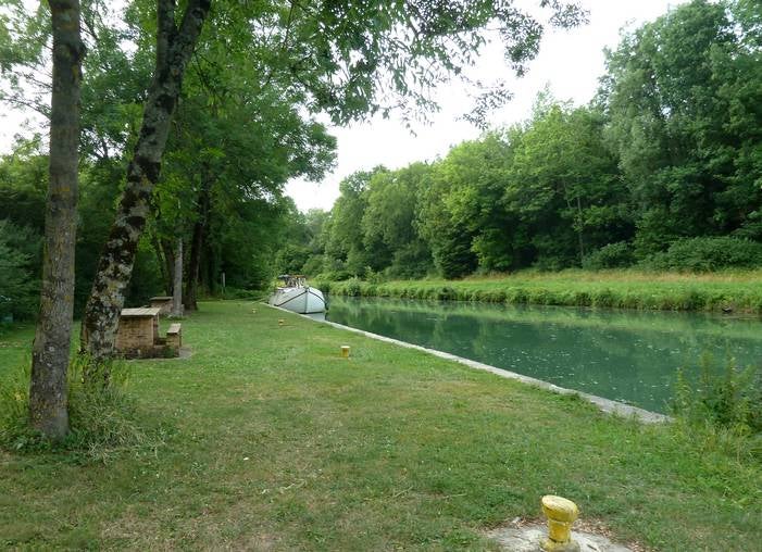 Achter mij liggen de mensen die bij Joigny aan de steiger lagen. Die waren ook van plan om een andere route te varen, en hebben van dit gebied geen vaarkaarten bij zich. Hun zoon(?) zal dit weekend vanuit Nederland op bezoek komen. Ze vragen mij op de boot voor een kopje koffie, en of ik een goede plek weet voor een ontmoeting. Mijn vaarkaart wordt erbij gehaald, en ik suggereer om voor Soissons aan te meren bij Villeneuve-Saint-Germain. Om 10.45 ga ik verder. Bij Variscourt zoek ik om 13.25 een schaduwplekje om te eten. Na nu heb ik heel wat foto,s gemaakt tot ik er - inmiddels op de Marne - achter kwam dat de SD-kaart vol was. Dus vanaf nu, af en toe alleen een foto genomen met mijn telefoon. Om 17.00 uur vind ik een schaduwplek (in het wild) bij km. 33. Het is dan 29 graden. Ik heb het niet genoteerd, maar waarschijnlijk ben ik hier ook, net als bij Variscourt , voor een frisse duik even de plomp in gegaan. In de loop van de avond verdwijnt de zon en vaar ik naar Bourg-et-Comin waar ik om 20.15 vastmaak, bij nu 25 graden. Ik lig met de achterkant naar een boot met een Engels stel die voortdurend op luide toon op elkaar vitten. Later op de avond krijgen ze bezoek van een stel dat voor hen ligt met de boot. Ik neem het zekere voor het onzekere, en draai de Aimée en ga zo ver mogelijk bij hen vandaan liggen. Gelukkig blijkt het allemaal niet nodig, want het stel neemt al snel weer afscheid.