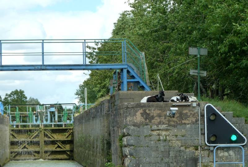 Om 9.15 vaar ik - de voor mij al ruim een halve dag openstaande - sluis in, en schut naar de andere kant. Twee sluizen verder bij Pagny-sur-Saulx werkt de sluis niet. Geen ideale plek om tegen de kant te gaan, maar met wat improviseren lukt het. Volgens een langsrijdende mobiele sluiswachter werken de sluizen op het hele traject niet, door een blikseminslag afgelopen nacht. Ik ben echter al twee probleemloos doorgekomen! Ik wordt handbediend door de sluis gelaten, en meer na de sluis aan, aan een mooie aanlegplaats tussen de twee dicht bij elkaar gelegen sluizen. Daar liggen een paar schepen - een Zwitser en een Nederlander die van de andere kant komen. Zij moeten ook wachten tot de storing voorbij is. Van de Nederlander, een oud beroepsschipper, hoor ik dat er op ruim 1,5 km een supermarkt is. Van hem hoor ik ook dat het water verderop soms behoorlijk laag staat, en dat ze ook nog al last hadden van waterplanten. Ik ga even "op fietse" naar de supermarkt voor mijn baquetje, eieren, en en wat lekkere hapjes, want ik krijg morgen bezoek. Omstreeks de middag werken de sluizen weer, en de twee schepen vertrekken richting Vitry-le-Francois. Ik vaar na het eten naar de sluis, en schut naar de andere kant. Onderweg passeer ik een sluis (filmpje) waar een paar geiten prinsheerlijk op de sluis liggen.