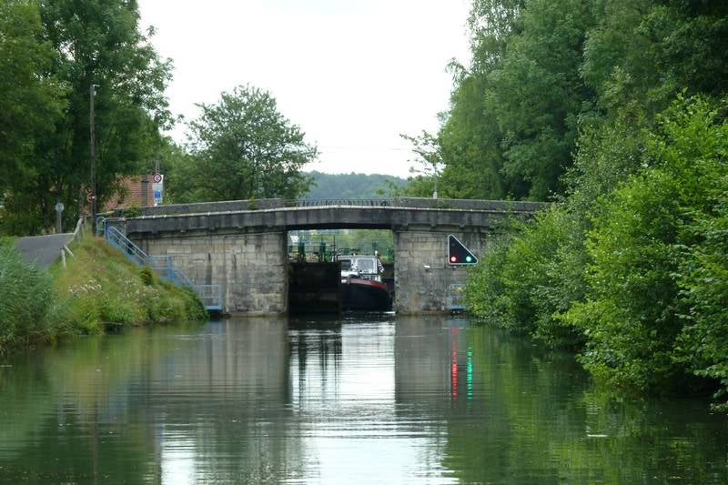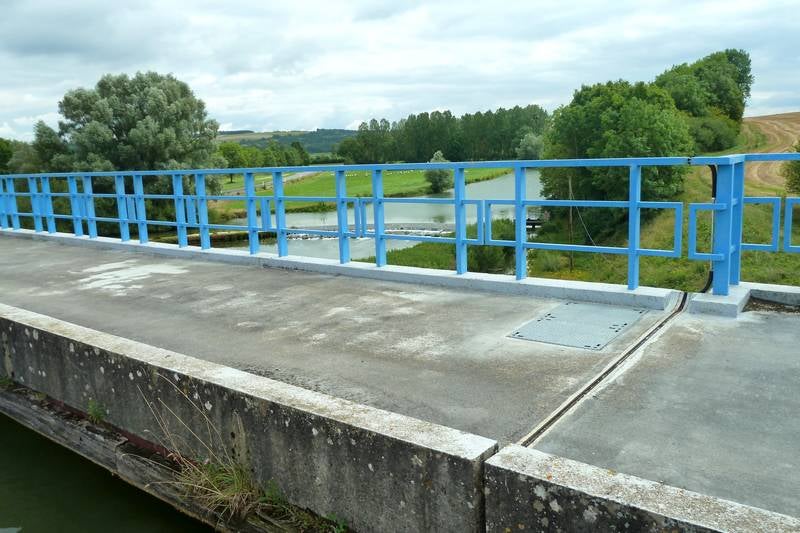 Dit blijkt achteraf een traject met haperende deuren te worden! Om 10.30 meer ik aan bij Tronville-en-Barrois. Aan een man die samen met een jongetje op de brug staat te vissen vraag ik of er een bakker in het dorp is. Die is vlakbij, en hij wijst waar die is. Terug even koffie met stokbrood, en dan weer verder, en een kwartier later voor sluis 27. Een deur gaat niet open. Bellen! Om 12 uur in de sluis. Zeshonderd meter verder sluis 26. De deuren gaan niet goed dicht. Bellen! Ik krijg het advies om nog een keer de blauwe stang omhoog te trekken. Dan gaan ze toch helemaal dicht!