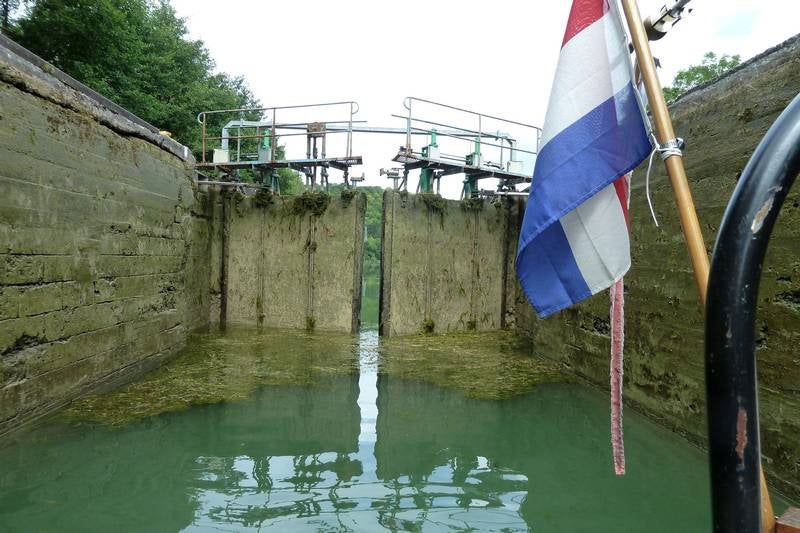 Om 12.30 meer ik aan in de haven van Toul. Erst op pad voor een stokbroodje, maar de bakker vlakbij is gesloten. Dan maar op de fiets naar een supermarkt die ik met behulp van mijn smartphone vind. Het was even zoeken, en fietsen, maar dan heb je ook wat. Mijn rugtas gaat vol mee terug, o.a een witte kool waar ik verschillende recepten voor mee heb. Die blijft best wel een poosje goed, en daar kan ik dus een aantal keer (gezond) van eten. Om 14.30 ga ik verder, en kan ik direct de sluis in varen. Dar krijg ik de mededeling dat het een uur kan duren voordat er geschut gaat worden. Ik breng de parasol in stelling, zwembroek en korte broek aan, en water opzetten voor koffie. Dat uur moet ik toch een beetje aangenaam zien door te komen. Het koffiewater is echter nog niet warm, of de deuren gaan dicht, en ik zak een paar meter. Een schip van de andere kant!