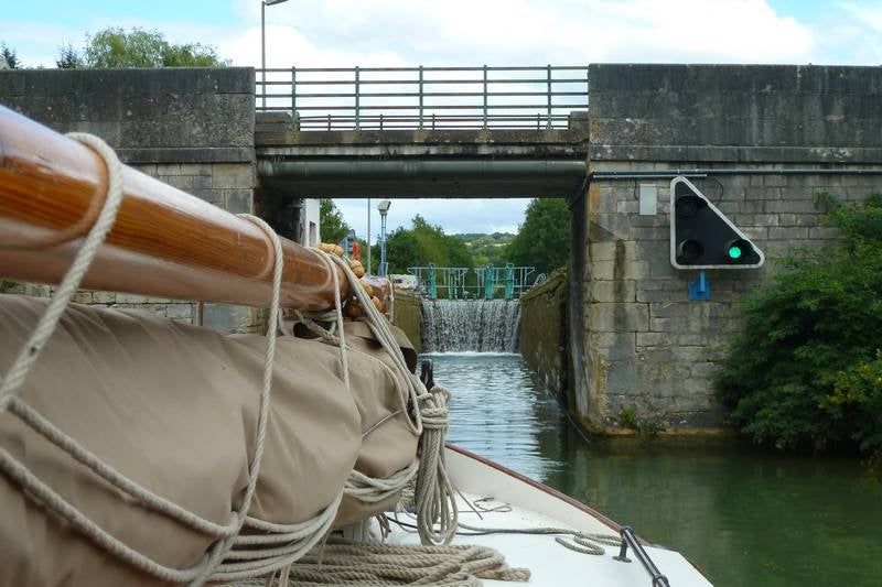Voor je het weet heb je de schroef vol. Uit de sluis bij Toul komt net een narrowboat.