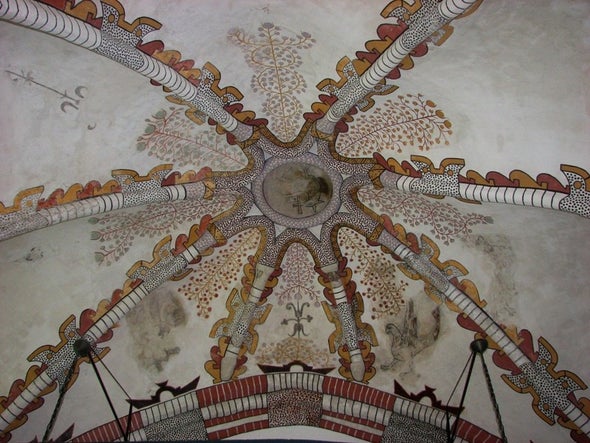 Een oud kerkje, en bij de ingang lees ik dat ik voor bezichtiging de sleutel op kan halen op Terpweg 4. Nu ik hier toch ben kan ik net zo goed de binnenkant ook bekijken, dus op naar de Terpweg. Het is al kwart over vijf wanneer ik aanbel, en wanneer een oudere vrouw open doet vertel ik dat ik voor de sleutel van de kerk kom, en of het daar nu niet te laat voor is. 'Oh nee hoor!' Ze trekt even een jas aan, en loopt zelf mee naar de kerk, en onderweg krijg ik al een stukje geschiedenis te horen van Godlinze en de kerk. Binnen zie ik een mooi gerestaureerd kerkje met uitbundig gedecoreerde gewelven waar mevrouw allerlei bijzonderheden over weet te vertellen. Ze weet er duidelijk veel van en is hoorbaar trots op de kerk en het dorp.